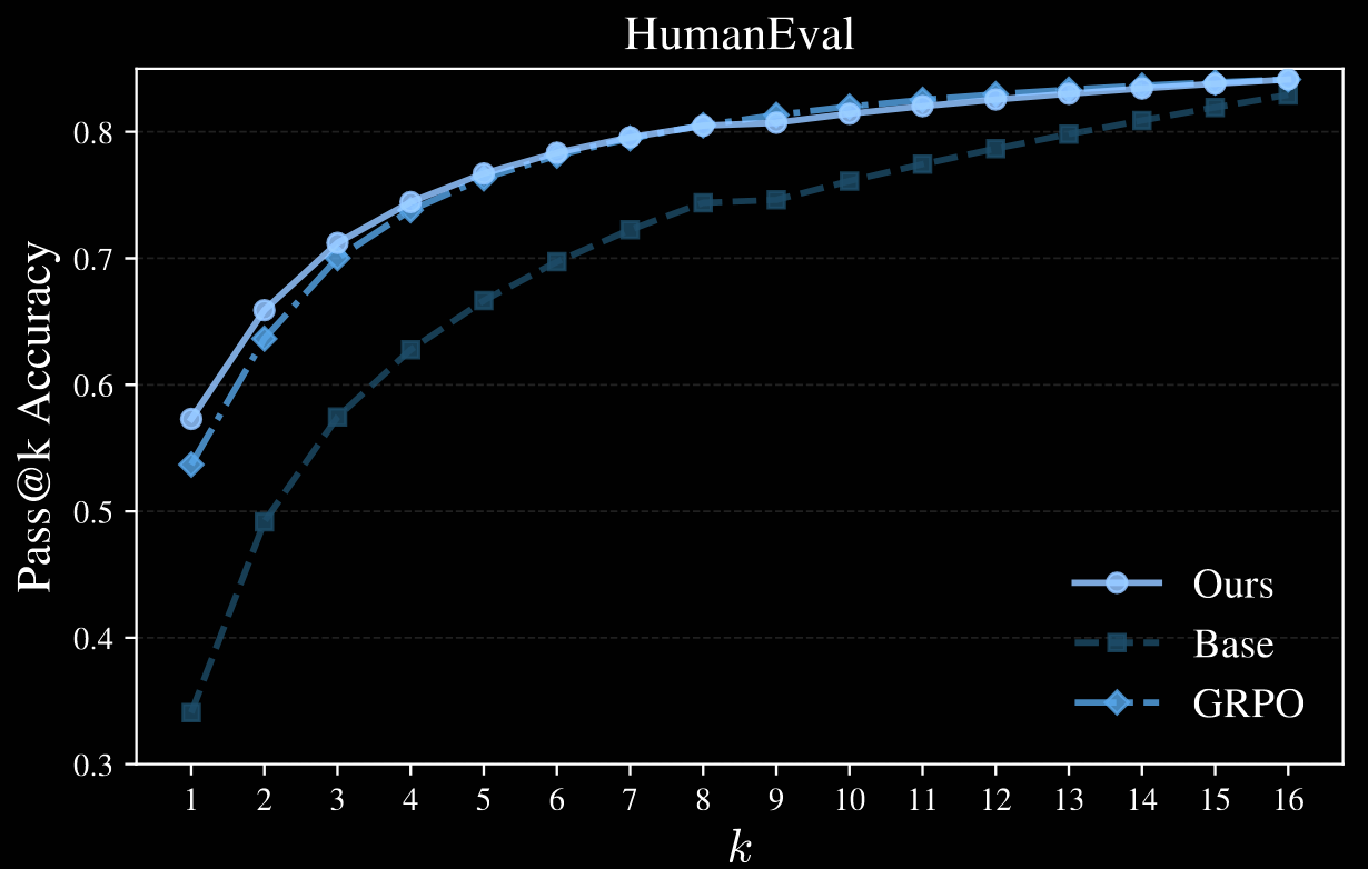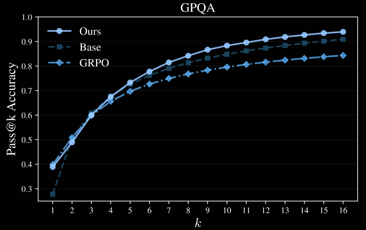 Post-training an LLM with RL often provides impressive improvements for pass@1, but pass@k decays for large . This raises the question, "Does RL develop new capabilities, or simply sharpen the distribution?" Eg, it may collapse to high-reward modes.